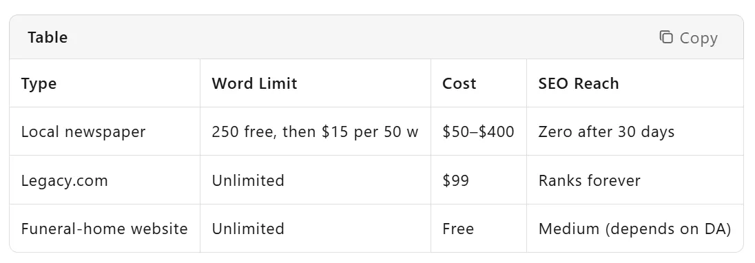 TypeWord LimitCostSEO ReachLocal newspaper250 free, then $15 per 50 w$50–$400Zero after 30 daysLegacy.comUnlimited$99Ranks foreverFuneral-home websiteUnlimitedFreeMedium (depends on DA)