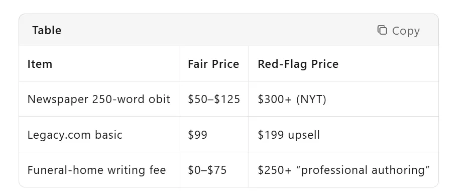 ItemFair PriceRed-Flag PriceNewspaper 250-word obit$50–$125$300+ (NYT)Legacy.com basic$99$199 upsellFuneral-home writing fee$0–$75$250+ “professional authoring”